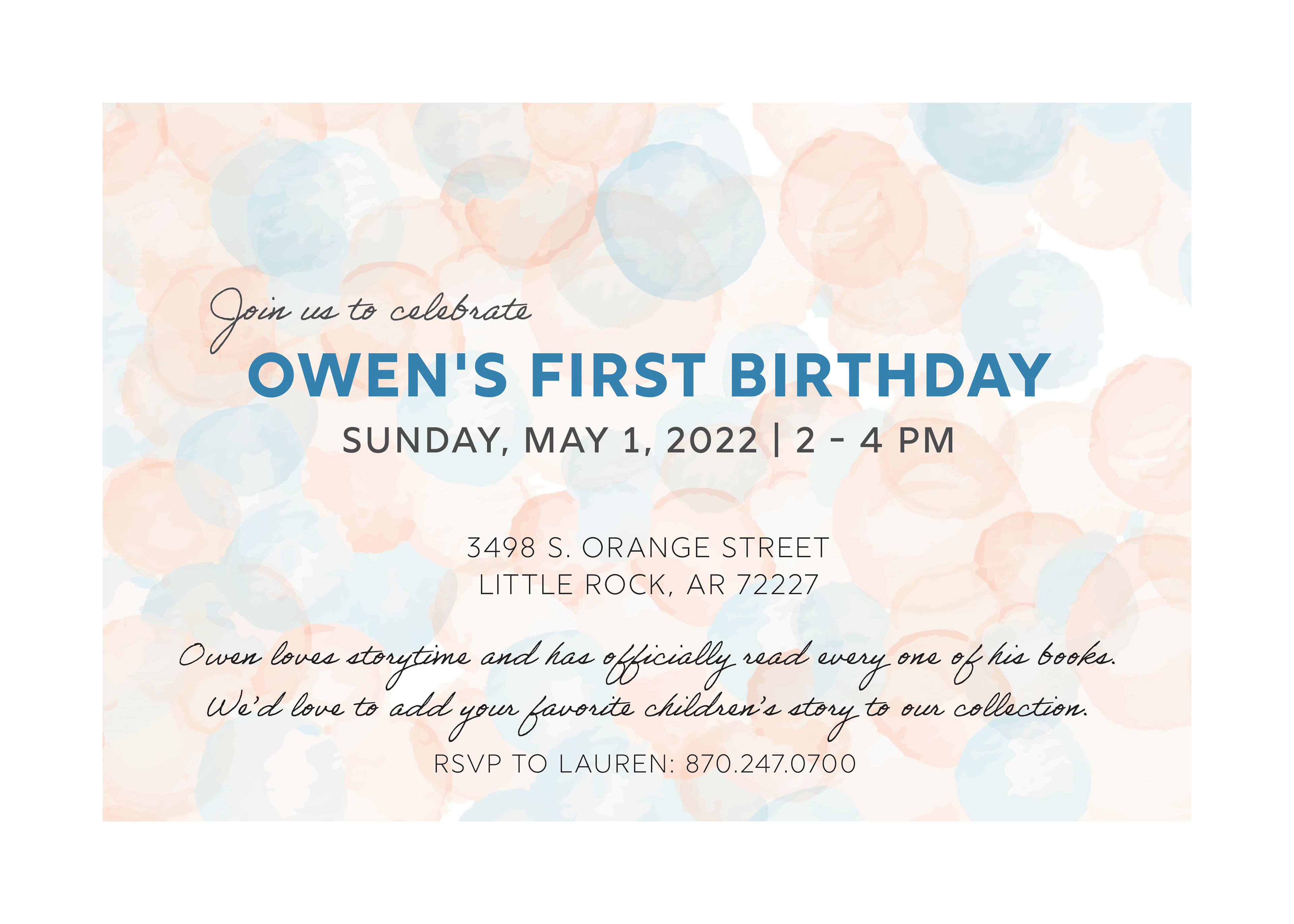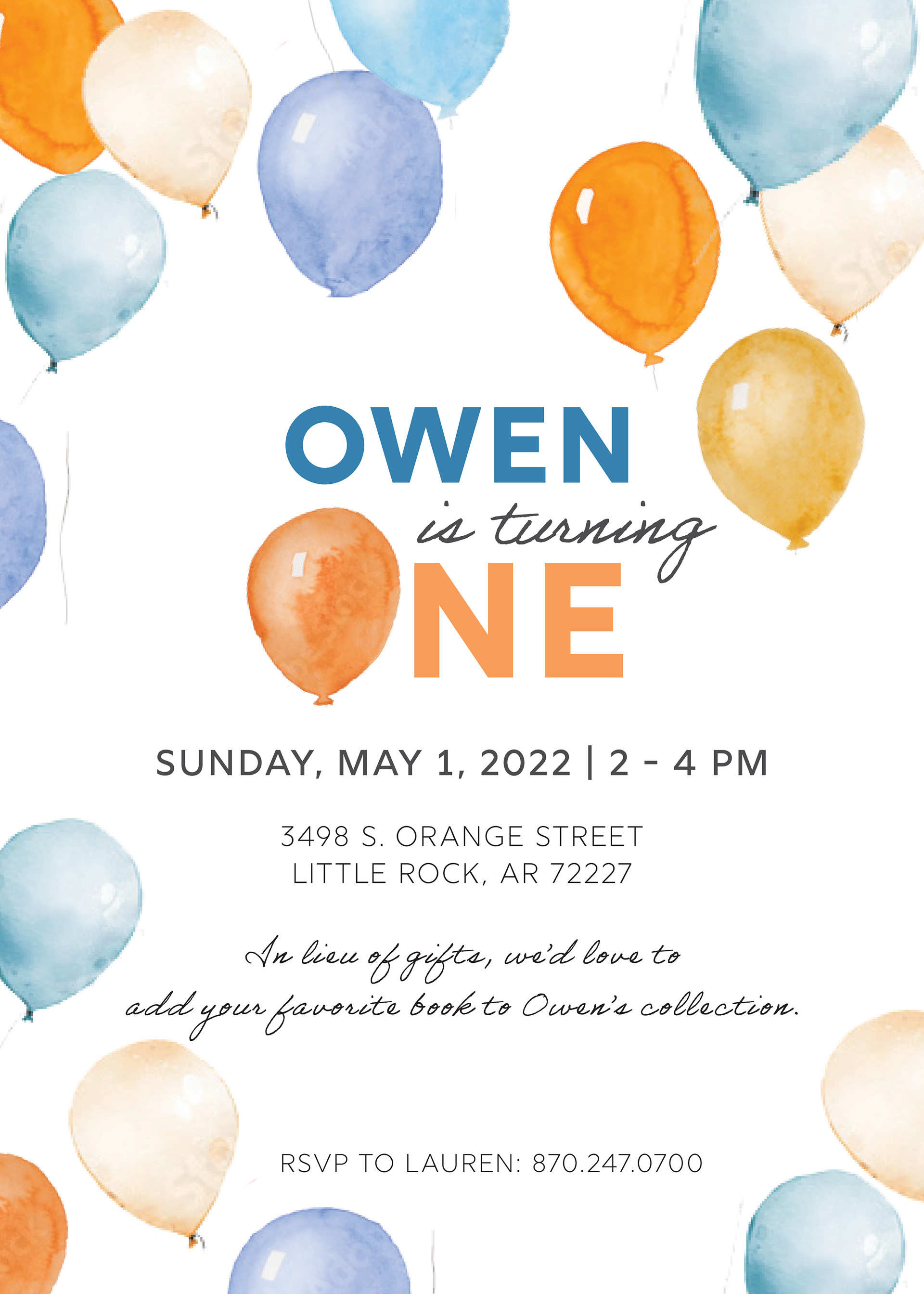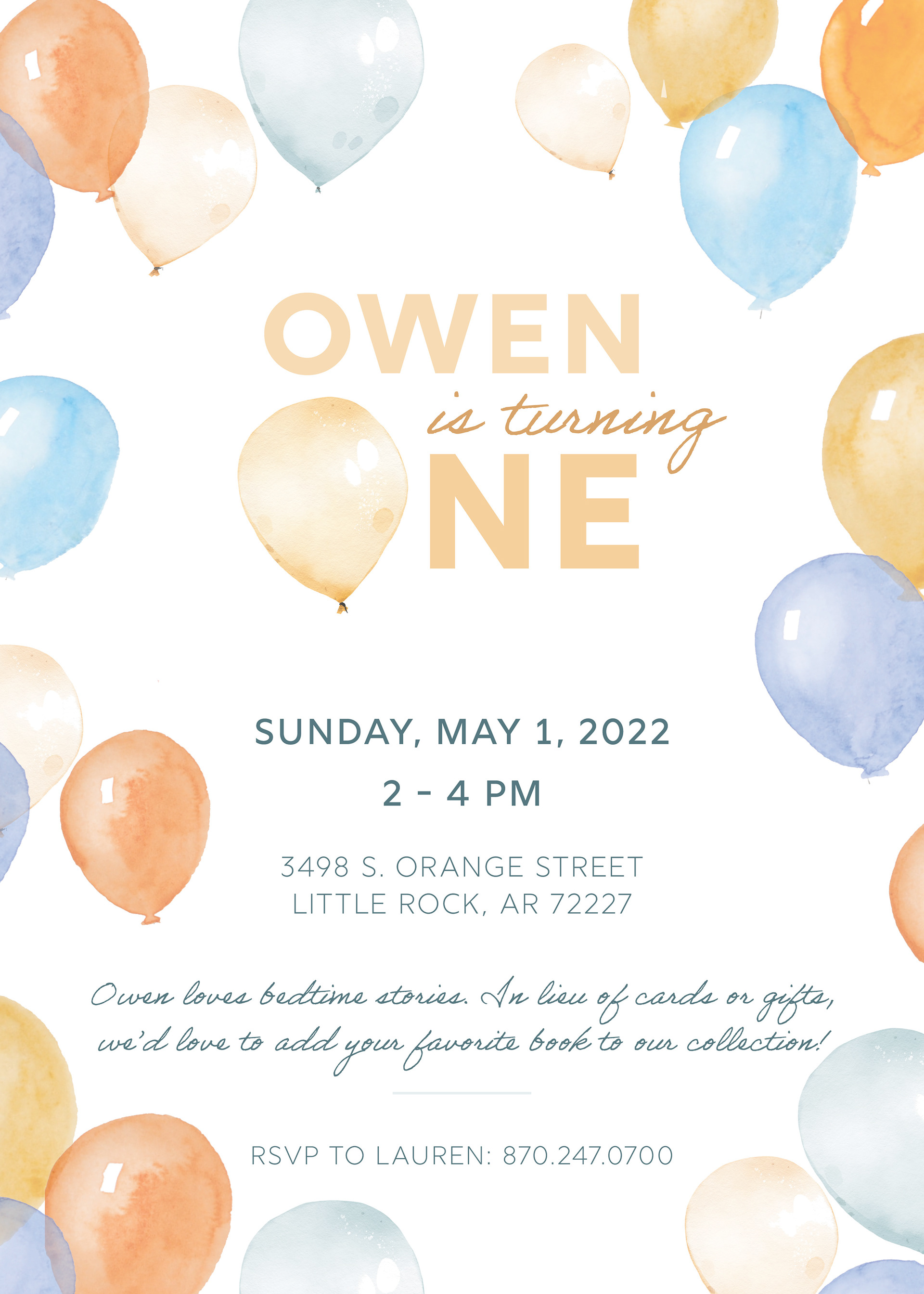 Lauren, Owen's mom, was looking for a design that featured watercolored balloons in a cheerful, but muted, color palette including blues, tans, and oranges. She also wanted to include a special request for guests to bring books instead of toys.